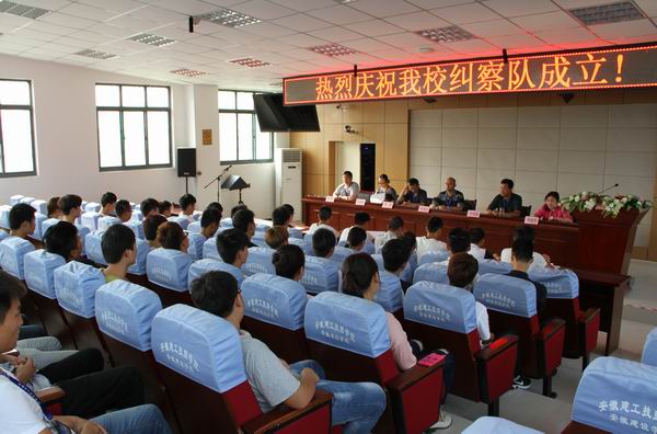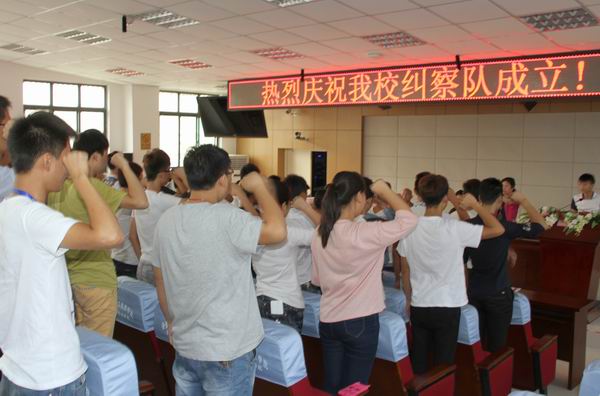 9月23日下午三點,校衛隊成立大會在學校錄播室舉行。副校長呂良玉、學生處處長付書亭、建筑工程系黨支部書記李波、機電工程系黨支部書記朱曉玲、建筑經濟管理系黨支部書記李繼萍、保衛處鮑少華老師和所有校衛隊成員參加了儀式。