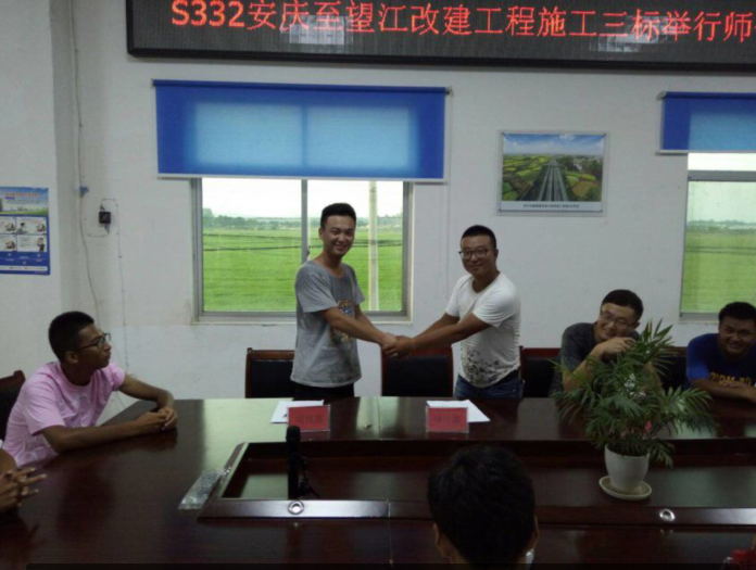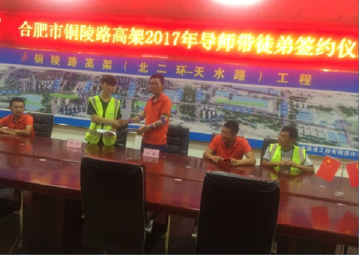 在銅陵路高架項目部,與會老員工結合自身崗位職責,一一分享自己的入職經歷,給新員工提出了意見建議,要求新員工轉變觀念,盡快適應和融入角色,鍛煉自己早日成長成才,為服務企業發展貢獻力量。團支部書記石海濤闡述了“導師帶徒”活動的目的和意義,要求導師通過“傳、幫、帶”的方式,將技術知識、職業道德作風傳授給新員工,切實有效地加快新學員理論知識到實踐能力的轉換進度,使新員工盡快更好地適應工作崗位,全身心地投入到工作和學習中。 3對師徒經過交流認知,雙向選擇后,現場簽字確立師徒關系。