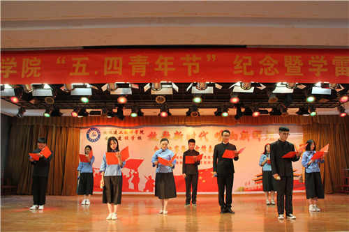 合唱比賽告一段落,在統分階段,新團員入團儀式開始。由校衛隊的四位同學護衛團旗伴隨著高亢激昂的中國共產主義青年團團歌莊嚴的走上舞臺,32名新團員代表也依次走上舞臺,他們代表全校700多名新團員面向團旗莊嚴宣誓。在鮮紅團旗的映襯下,誓詞將激勵著團員們在今后的學習、生活中不斷向前邁進。宣誓完畢,院領導上臺為新團員代表佩戴團徽。接著由廣播站的同學帶來詩歌朗誦《五四、您永遠年輕》。