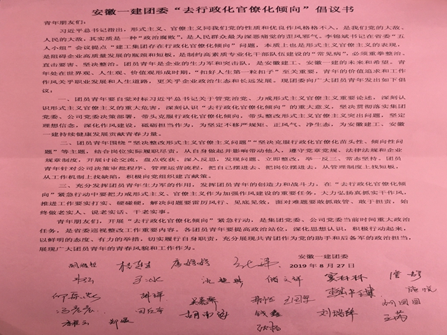 (四)在2019年的“去行政化官僚化傾向”的活動中,團委組織青年倡議活動,團員青年嚴格要求自己,不搞形式主義、官僚主義并堅決抵制,大力弘揚真抓實干作風。同時各團支部組織青年團員結合公司的實際、自己崗位職責,對公司的制度文件、審批流程、決策程序、管理制度等方面進行討論交流并提出相關的意見建議。