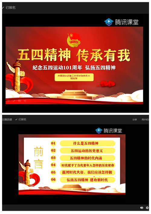 2020年是五四運(yùn)動101周年。隨著疫情防控進(jìn)入新的時期,安徽建工技師學(xué)院團(tuán)委利用特殊的線上“云團(tuán)課”方式與團(tuán)員們一起用全新的方式紀(jì)念五四運(yùn)動,向青春致敬!本次“云團(tuán)課”以“五四精神,傳承有我”為主題,由學(xué)院團(tuán)委書記周曉瑛主持,全院71名學(xué)生團(tuán)干部參加學(xué)習(xí)。
