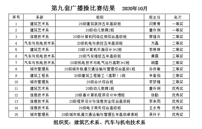 此次廣播操比賽,為各個班級搭建了團結、拼搏、健康、向上的平臺,既鍛煉了學生的體魄,又培養了學生的組織性和紀律性和集體榮譽感,增強了各班級凝聚力,充分展示了我院學生朝氣蓬勃和奮發向上的精神風貌。