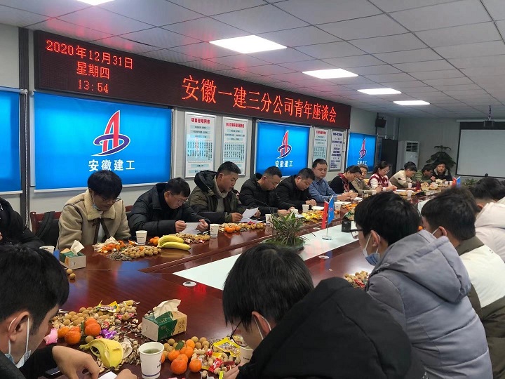 2020年12月31日,安徽一建三分公司在錦繡龍川府EF地塊項目部會議室召開青年座談會。分公司領導、機關及所屬項目部青年職工代表近60人參加座談。
