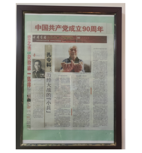 孔令科老人,1926年出生,1941年參軍入伍, 1946年加入中國共產黨,14歲加入新四軍,戎馬生涯中參加過抗日戰爭和解放戰爭,多次立下二等功。在講起那段槍林彈雨、戰火紛飛的革命年代時,他不免有些激動。令我們印象最深的是在戰爭中有五顆手榴彈滾到了他的腳下,幸運的是只有一顆爆炸了,導致右腿右臂受重傷,多處留有彈片。如今95歲高齡的孔老,身體硬朗、思維清晰,始終保持著每天讀書看報的好習慣,在靜享慢讀中,沉淀出生活的安靜與從容。如今的和平時代是無數革命先烈用鮮血和生命換來的,沒有他們浴血奮戰,何來祖國今日繁榮昌盛?百年征程波瀾壯闊,百年初心歷久彌堅,祖國大地留下的是無數先輩們奮斗的足跡,流傳著感人肺腑的故事。臨走前,滿頭銀發的孔老不斷重復著:“你們生在好時代,大家都年輕,一定要多讀書多學習”。