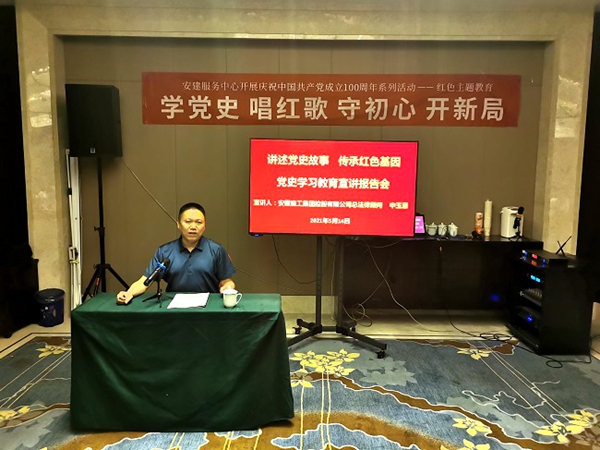 5月14日,集團控股公司總法律顧問、集團黨史學習教育第六宣講組組長申玉恩為服務中心全體員工就黨史學習教育作專題宣講報告。會議由中心黨總支書記、總經理施愛民主持。