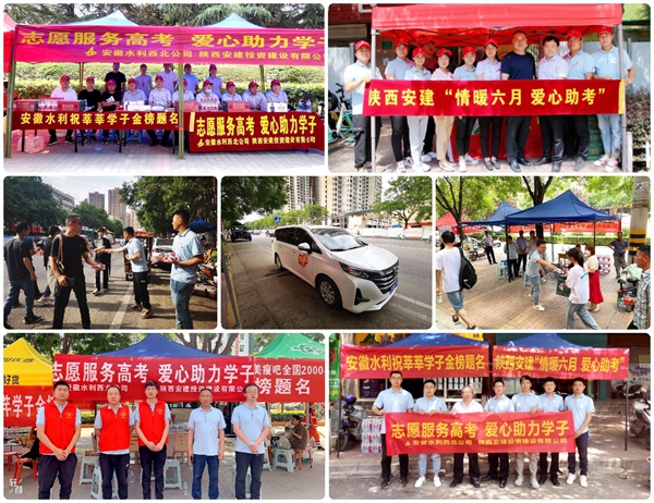 陜西安建黨總支精心籌備,組織各支部開展“情暖六月 愛心助考”志愿服務活動,分別在渭南市富平縣實驗中學、彬州市范公中學、咸陽市渭城中學和咸陽中學設置四個志愿服務點,為考生和家長提供考試用具、避暑物品、休息場地和接送服務,用實際行動助力夢想起航,共50余名黨員團員志愿者參加活動。