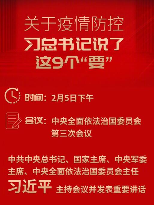 2月5日下午,中共中央總書記、國(guó)家主席、中央軍委主席、中央全面依法治國(guó)委員會(huì)主任習(xí)近平主持召開中央全面依法治國(guó)委員會(huì)第三次會(huì)議強(qiáng)調(diào),全面提高依法防控依法治理能力,為疫情防控提供有力法治保障。