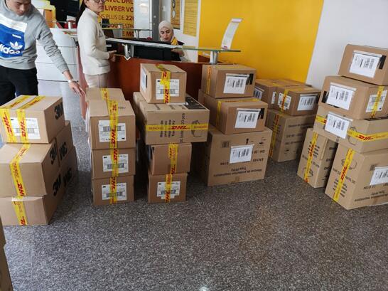由于采購的防疫物資數(shù)量大,而又恰逢周末,貨運公司人手不足。為爭分奪秒,縮短物資發(fā)運時間,采購小組主動前往DHL航空貨運公司,協(xié)助貨運公司工作人員對防疫物資進行分裝、打包、貼簽。然而難題又出現(xiàn)了,按照貨運公司規(guī)定,大宗物資必須分批次進行報關(guān)發(fā)貨,這樣好不容易采購到的防疫物資就不能全部在第一時間內(nèi)抵達國內(nèi)。經(jīng)過討論和咨詢,并與貨運公司反復(fù)協(xié)商,駐阿經(jīng)理部決定以公司名義辦理報關(guān),并迅速整理遞交了報關(guān)資料,全力協(xié)助DHL貨運公司發(fā)運防疫物資,最大限度確保防疫物資盡快運抵國內(nèi)。