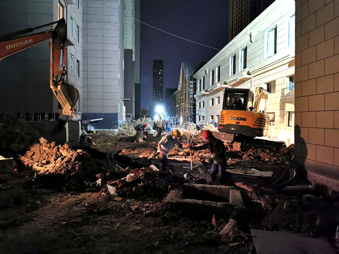 為保障六月底順利交房,工程管理部及楓林源筑項目組織力量搶節點,24小時三班倒,7#樓北側及12#樓北側道路澆筑前鋪設所有管網,爭取四月底南區作業面基本完工。同步積極與各驗收主管部門溝通聯系,邀請預驗。