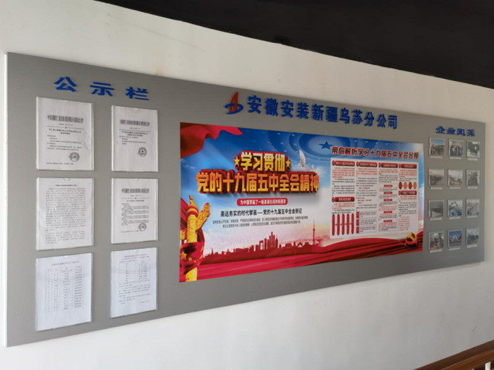 走進安徽安裝公司新疆烏蘇分公司辦公區,一塊紅色的黨建公開欄首先映入眼簾。公開欄還包括黨員風采、公示欄、黨務公開、光榮榜等板塊,成為分公司一處醒目的景觀。