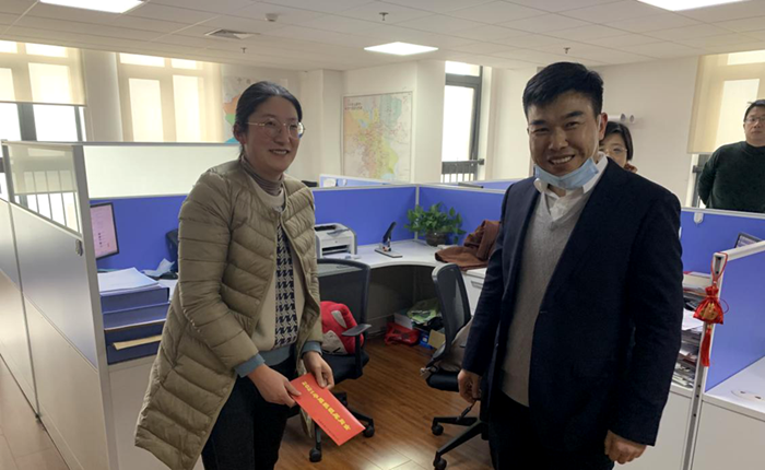 2月5日下午,安建地產(chǎn)黨委副書記、總經(jīng)理?xiàng)詈ow慰問天長公司職工徐園園。