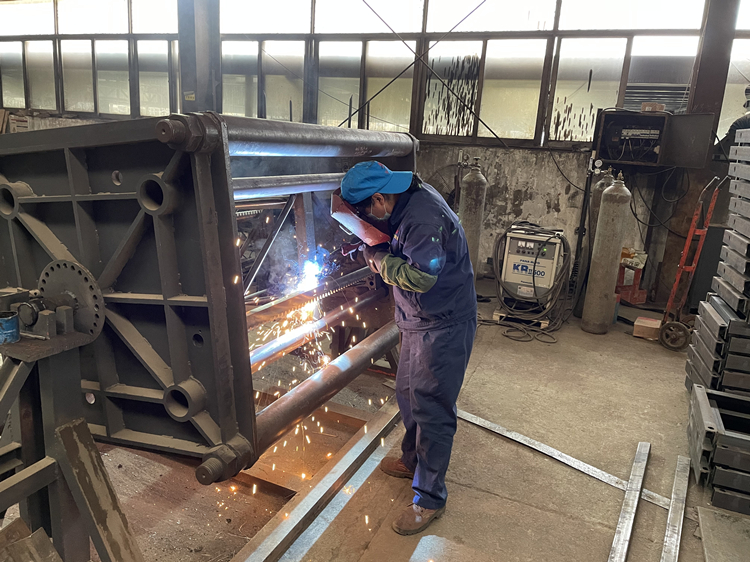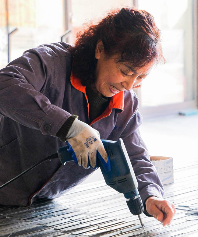 門窗公司女工王來菊在車間工作區域進行材料加工工作,為搶門窗生產進度