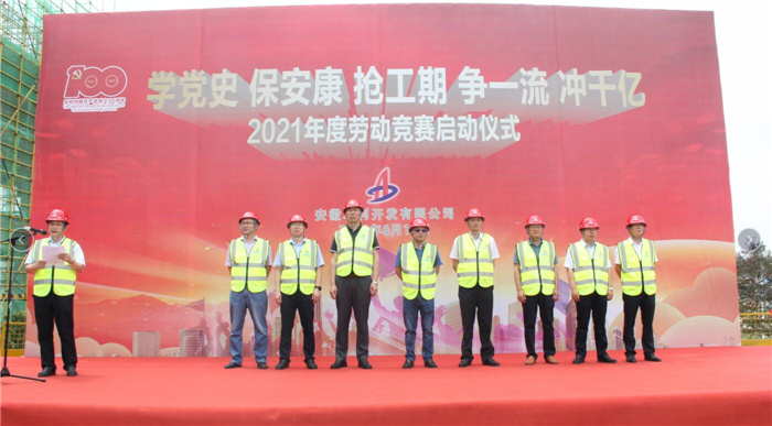 6月16日上午,安徽水利2021年“學(xué)黨史、保安康、搶工期、爭(zhēng)一流、沖千億”勞動(dòng)競(jìng)賽啟動(dòng)儀式,在安徽水利城建公司上海(蚌埠)微電子科技園項(xiàng)目施工現(xiàn)場(chǎng)舉行。安徽水利黨委書(shū)記、董事長(zhǎng)張曉林出席啟動(dòng)儀式,并宣布勞動(dòng)競(jìng)賽正式啟動(dòng)。