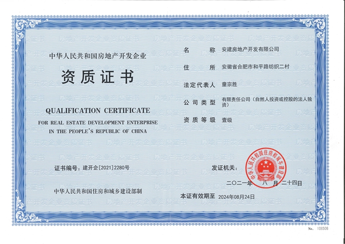 2021年9月6日,安建地產正式獲得國家住房和城鄉建設部頒發的房地產開發一級資質企業證書,標志著安建地產資質升級建設取得了全面成功,公司已達到房地產行業資質的最高級別。