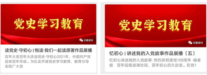 堅持“平臺創新”學。黨史學習教育要更“鮮活”,內容形式首先要更“新穎”。為擴大黨史學習教育受眾面,安徽建科黨委深入探索黨史學習教育新模式,策劃開展“悅讀·我們一起讀原著”黨史專欄音頻征集活動和“憶初心·講述我的入黨故事”主題短文活動,通過“全員參與、讀講并舉、共享悅讀”的方式,近百名黨員主動領學領讀,帶頭分享入黨故事,重溫入黨誓詞……一段段經典原著、一個個先進事跡、一則則暖心故事通過微信平臺“聲”入基層、深入人心,黨史學習教育不斷縱深推進。累計展播黨史音頻作品28段、入黨初心故事46篇,閱讀量3000余次,得到了較好反響。堅持正確輿論導向,強化宣傳引導,集中刊登建黨百年宣傳標識和標語,開設獻禮建黨百年系列報道專欄,精心拍攝《五一專欄|致敬每一位辛勤的勞動者》《不忘初心》主題微視頻,為黨史學習教育營造良好輿論氛圍。
