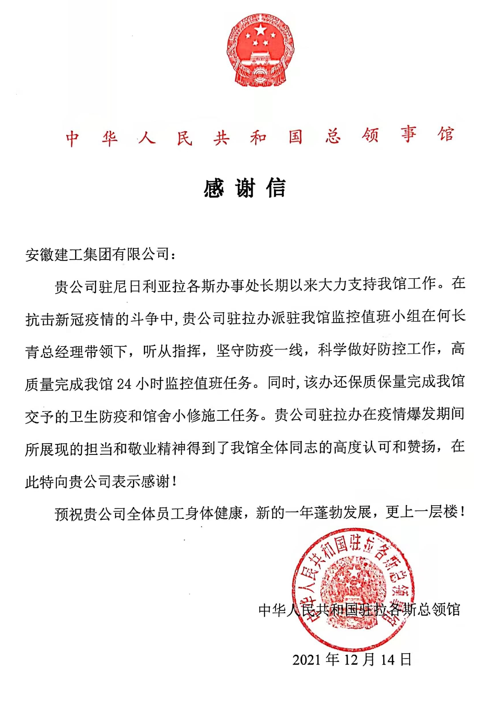 安徽建工集團收到中國駐拉各斯總領館感謝信