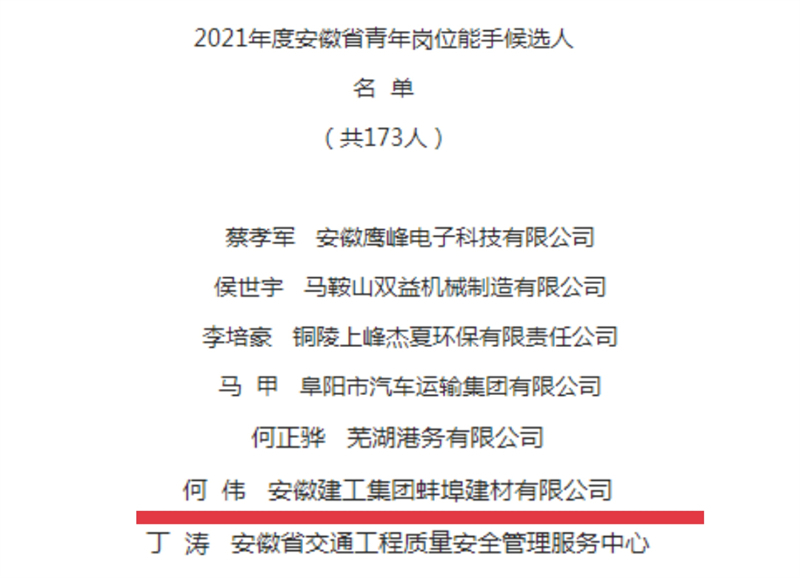 近日,共青團(tuán)安徽省委傳來(lái)喜訊,安徽建工建材科技集團(tuán)有限公司職工何偉被授予“2021年度安徽省青年崗位能手”榮譽(yù)稱號(hào)。