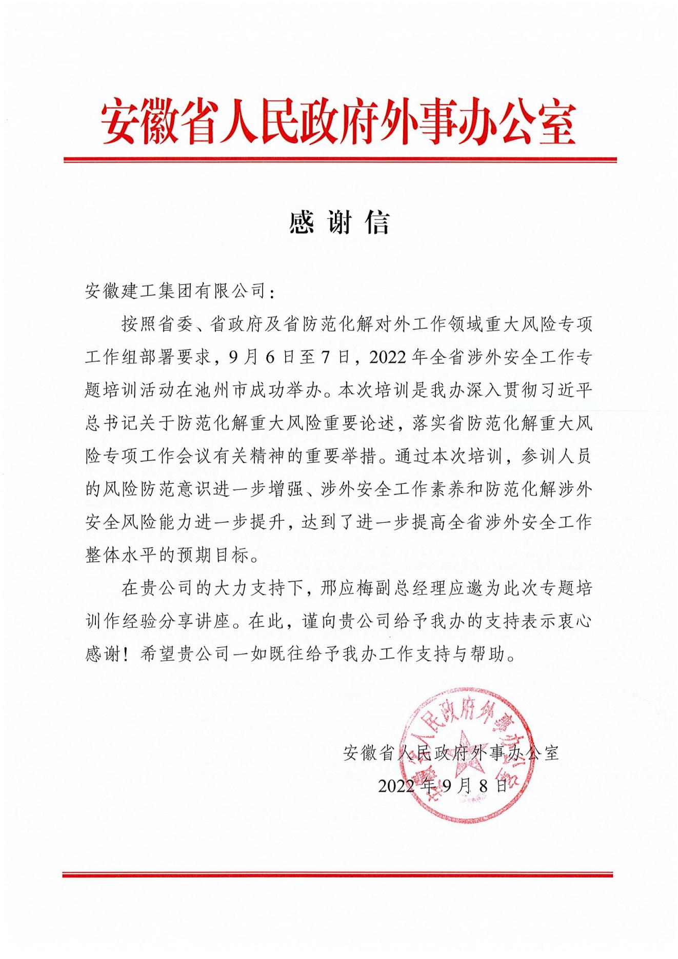 近日,安徽省人民政府外事辦公室向安徽建工集團發來感謝信,對集團在全省涉外安全工作專題培訓活動中給予的支持表示感謝。