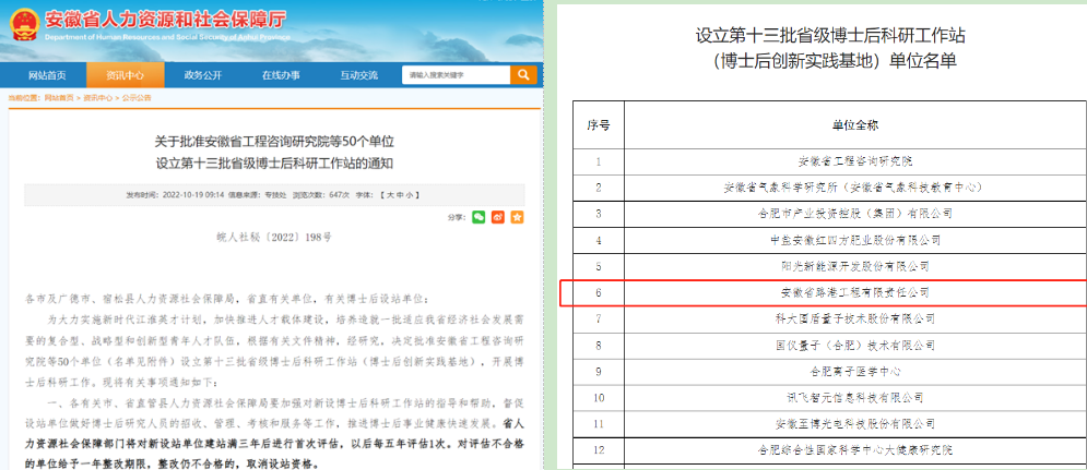 近日,安徽省人力和資源保障廳發(fā)布了《第十三批省級(jí)博士后科研工作站(博士后創(chuàng)新實(shí)踐基地)名單》(皖人社秘〔2022〕198號(hào)),集團(tuán)所屬安徽省路港工程有限責(zé)任公司成功獲批省級(jí)博士后科研工作站,自此集團(tuán)公司博士后工作站規(guī)模達(dá)3個(gè),標(biāo)志著集團(tuán)公司在高水平科學(xué)研究、高層次人才培養(yǎng)方面又取得了重大突破。