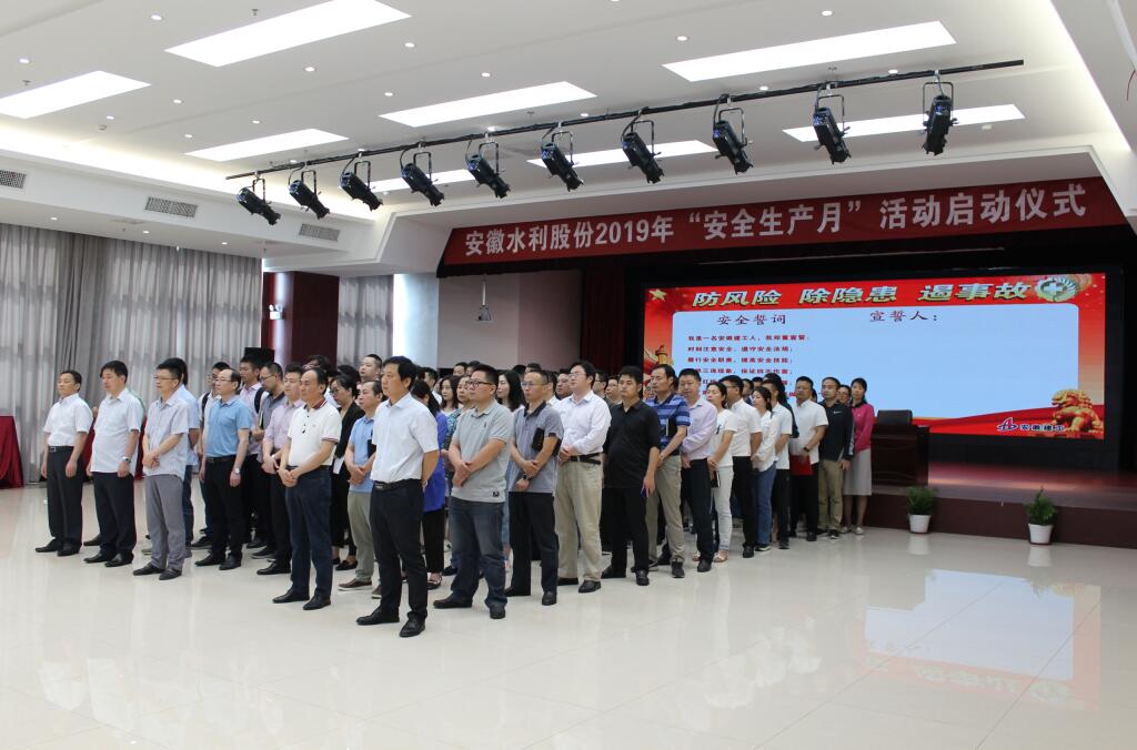 5月31日上午,安徽水利開發股份有限公司舉行了以“防風險、除隱患、遏事故”為主題的2019年“安全生產月”活動啟動儀式。股份公司安委會主任、總經理許克順出席儀式并講話,股份公司安委會副主任、副總經理孫學軍主持儀式并領誓,股份公司總工程師楊斌、股份機關全體員工、安建建設、安建海外及安建財務相關人員參加了啟動儀式。