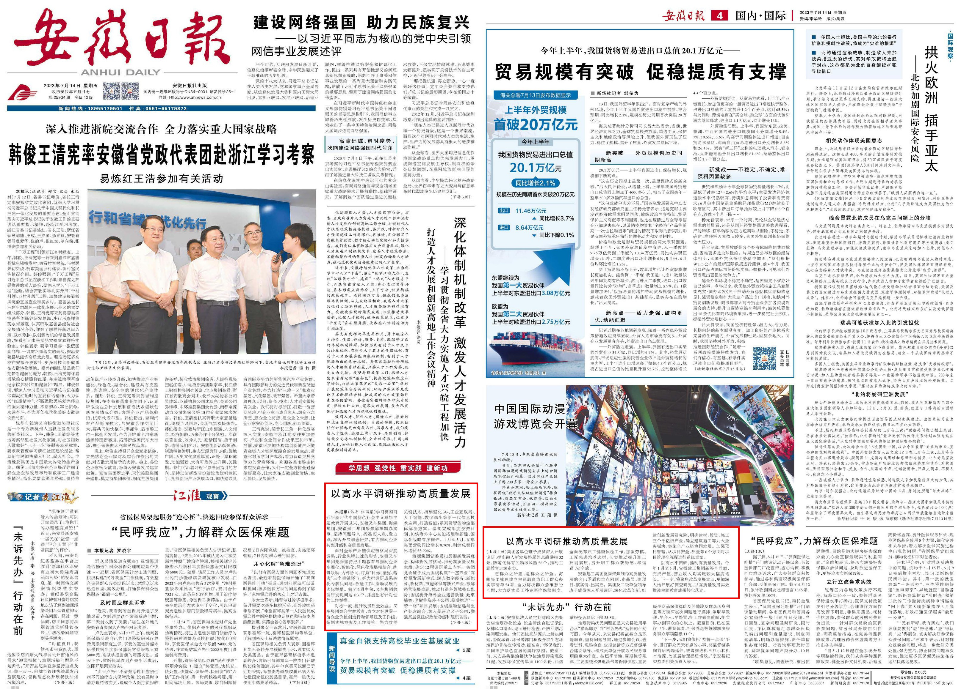 7月14日,安徽日報以《以高水平調研推動高質量發展》為題報道安徽建工集團主題教育開展情況。以下是報道部分內容: