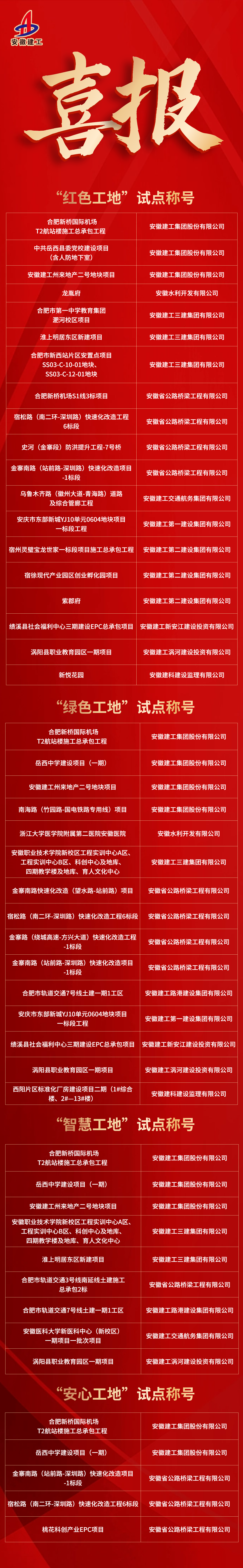 近日,安徽省住房和城鄉(xiāng)建設(shè)廳公布了2023年第一批“四個工地”試點項目名單,安徽建工集團48個項目上榜,“紅色工地”試點項目19個、“綠色工地”試點項目15個、“智慧工地”試點項目9個、“安心工地”試點項目5個。