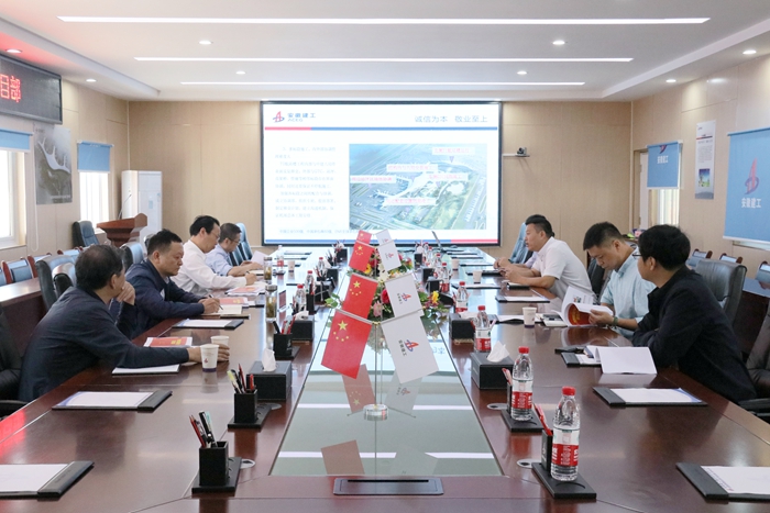 會前,李有貴同安徽民航機場集團總經理助理、合肥新橋機場改擴建工程建設指揮部副指揮長楊永勝座談交流。