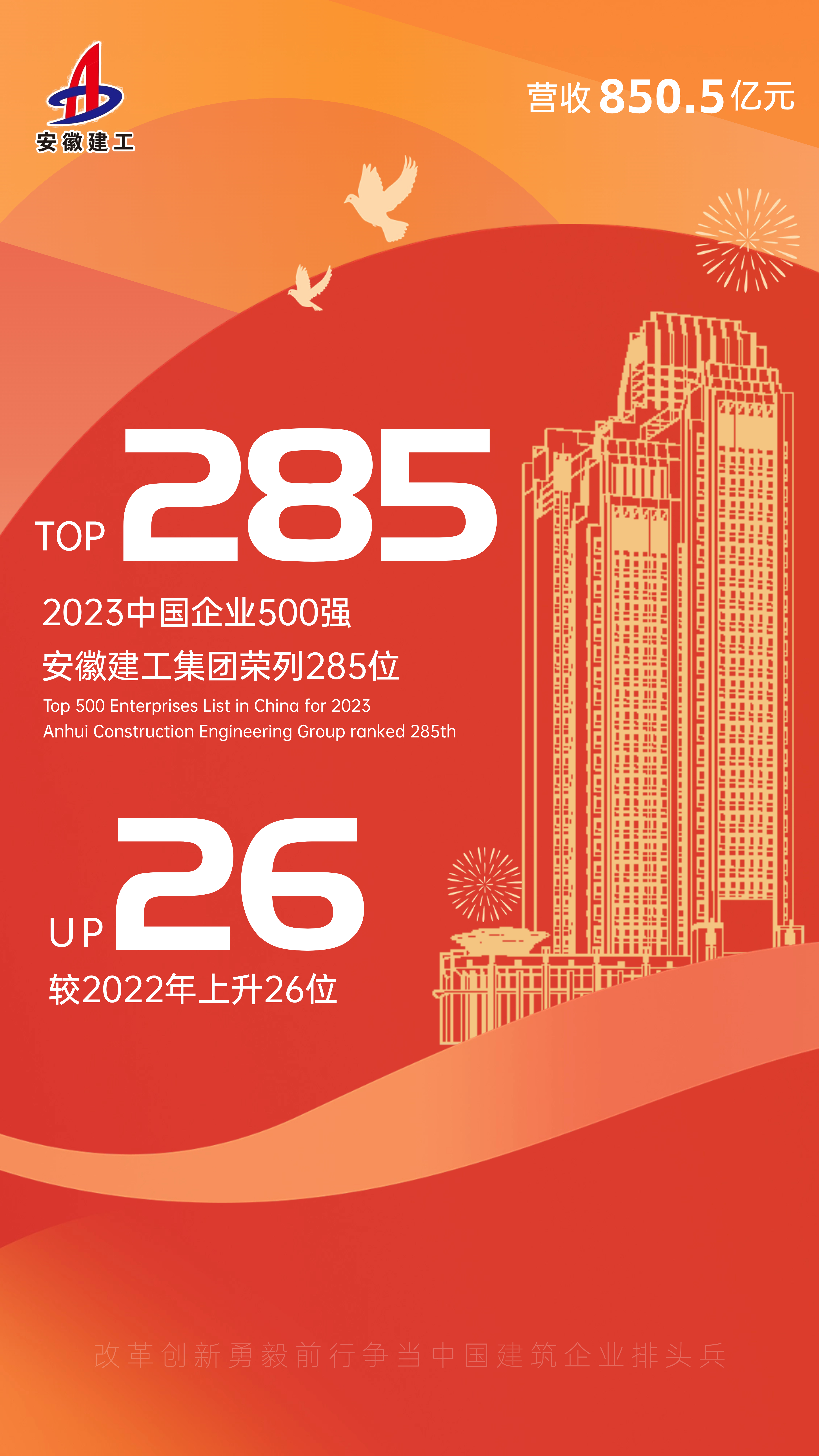 9月20日,中國企業聯合會、中國企業家協會發布“2023中國企業500強”,安徽建工集團以年營業收入850.5億元的成績榮登中國企業500強第285位,較上一年提升26位。