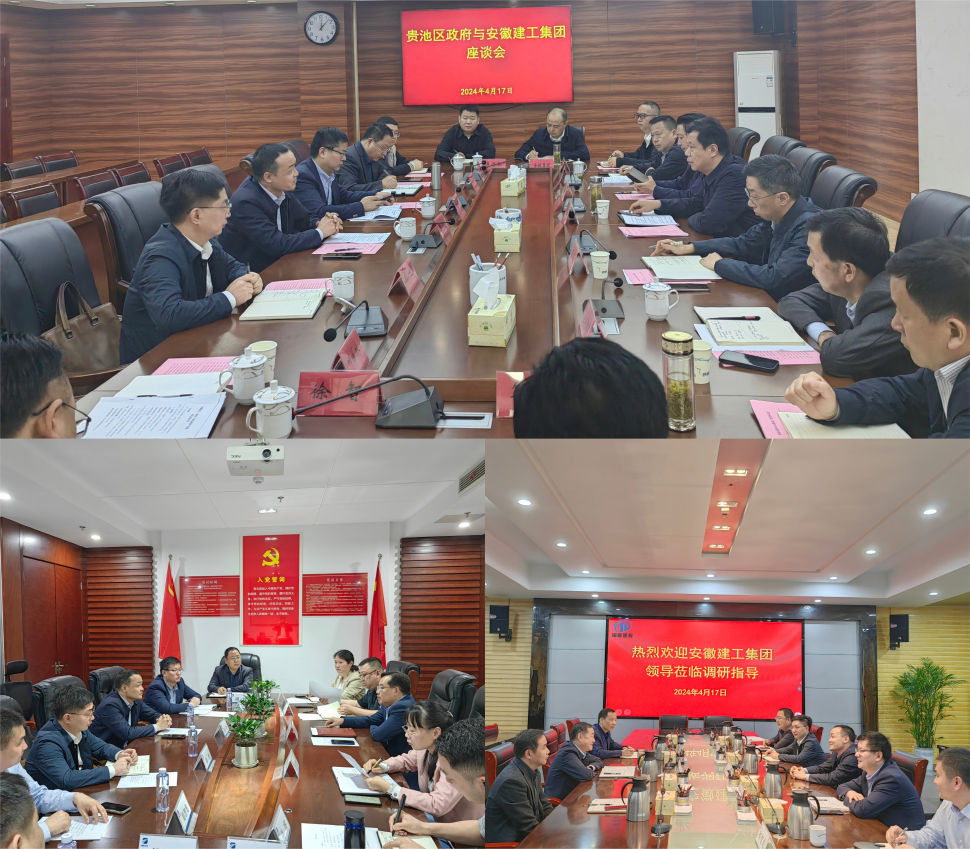 4月17日,建工股份副總經理、商貿物流黨委書記、董事長張沖一行到池州市和銅陵市,和池州市委常委、貴池區委書記馬勝利、區委副書記、區長錢松,銅陵交投黨委副書記、總經理龍道寧,銅陵建投黨委副書記、總經理張明等商談合作。