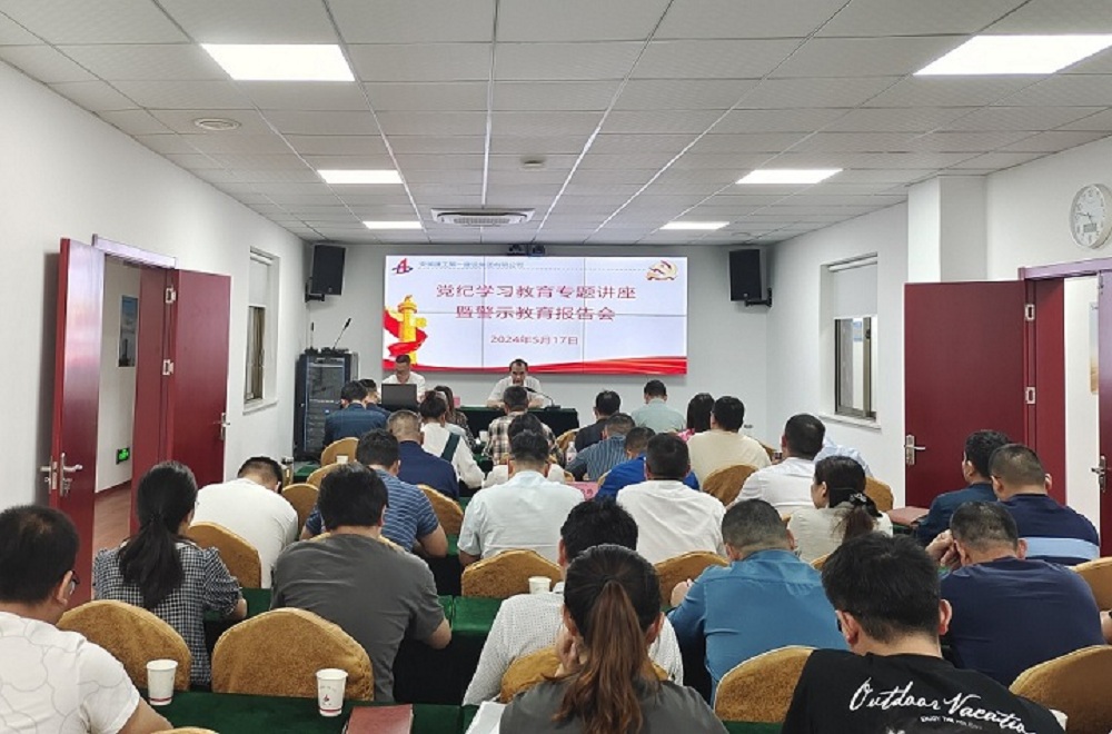 5月17日下午,建工一建黨委舉辦黨紀學習教育專題講座暨警示教育報告會。安慶市中級人民法院政治部副主任、機關黨委專職副書記、機關紀委書記錢澤民應邀授課,建工一建黨委委員、紀委書記陳楠主持會議。