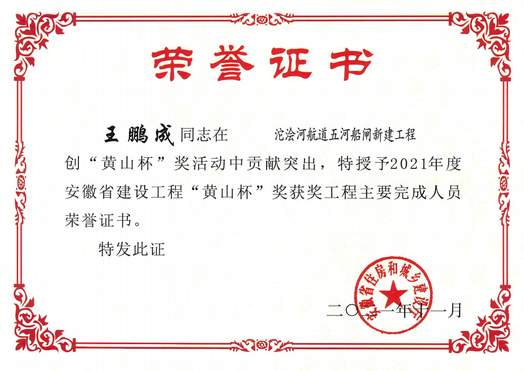 在參與五河船閘04標項目建設的過程中,他在做好施工現場管理工作的同時,更是以積極主動的態度,與地方主管部門建立了良好的關系,確保了桿線遷移等關鍵工作順利進行,極大提升了項目推進效率。在項目進入后期階段后,他主動與終審人員溝通對接,成功將審減額從初審的240萬元大幅減少至終審的40萬元,這不僅為項目帶來了經濟效益,也充分體現出他的專業能力和敬業精神。2021年,五河船閘項目被評為省優質工程獎,他本人也榮獲了“黃山杯”主要完成人員榮譽稱號。