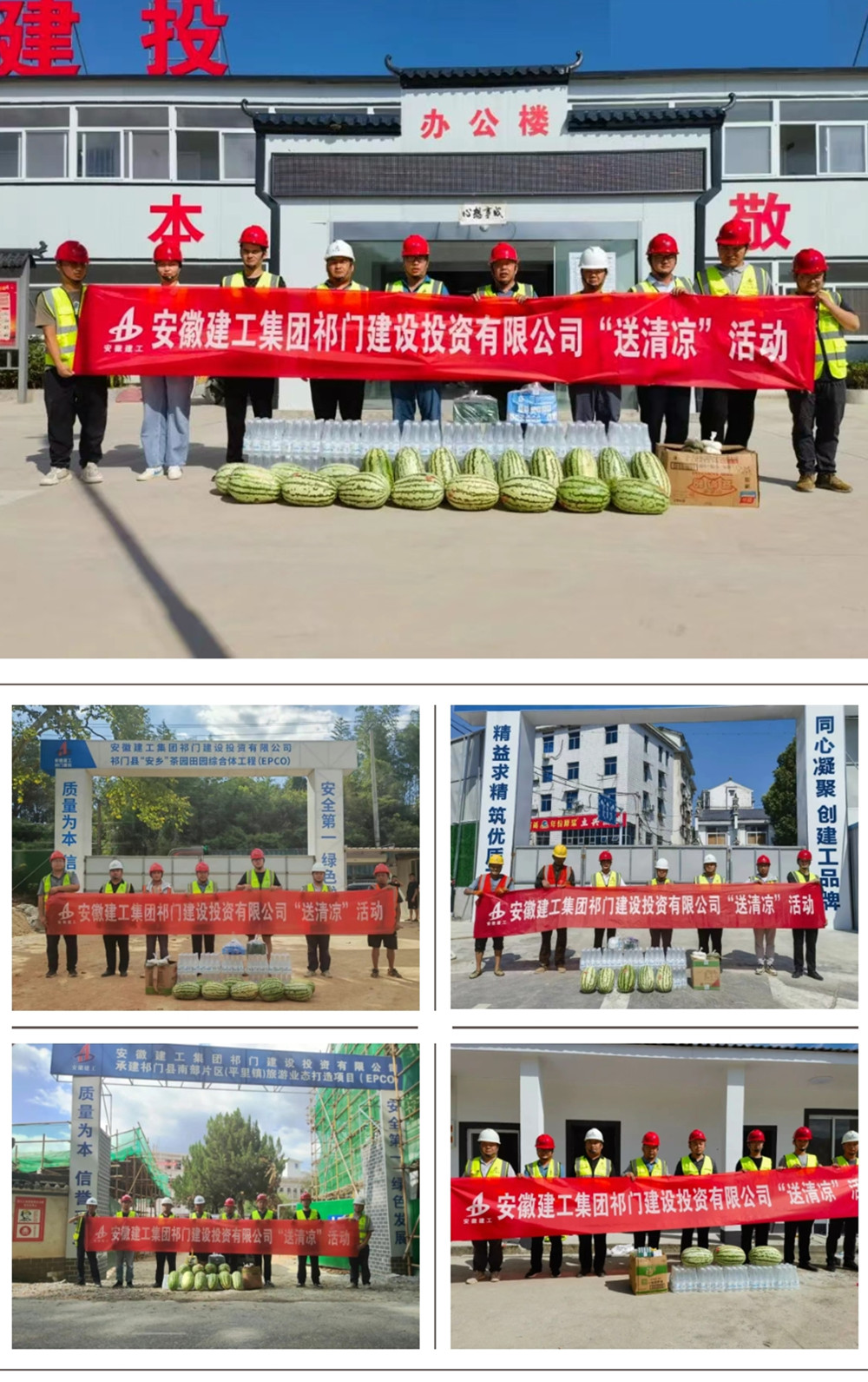在F012塔坊至平里公路改建工程項目、“安鄉(xiāng)”茶園田園綜合體工程項目、南部片區(qū)(平里鎮(zhèn))旅游業(yè)態(tài)打造項目、祁門經(jīng)濟開發(fā)區(qū)低碳科創(chuàng)園基礎(chǔ)設(shè)施項目、電商物流產(chǎn)業(yè)園項目、梅城大廈建設(shè)工程項目的施工現(xiàn)場祁門建投領(lǐng)導班子為一線工作人員送去綠豆、人丹、十滴水、西瓜、礦泉水等防暑降溫物品,對高溫下堅守一線的員工表示誠摯的慰問和衷心的感謝,叮囑大家要注意休息,提高自我保護意識。同時,要求項目管理團隊要認真落實好防暑降溫各項措施,備足備齊防暑降溫物資,守牢安全生產(chǎn)底線,合理安排工作時間,采取減少高溫時段室外作業(yè)、輪換作業(yè)、減輕勞動強度等措施,把防暑降溫工作落到實處,確保一線員工的身體健康和施工生產(chǎn)安全有序推進。