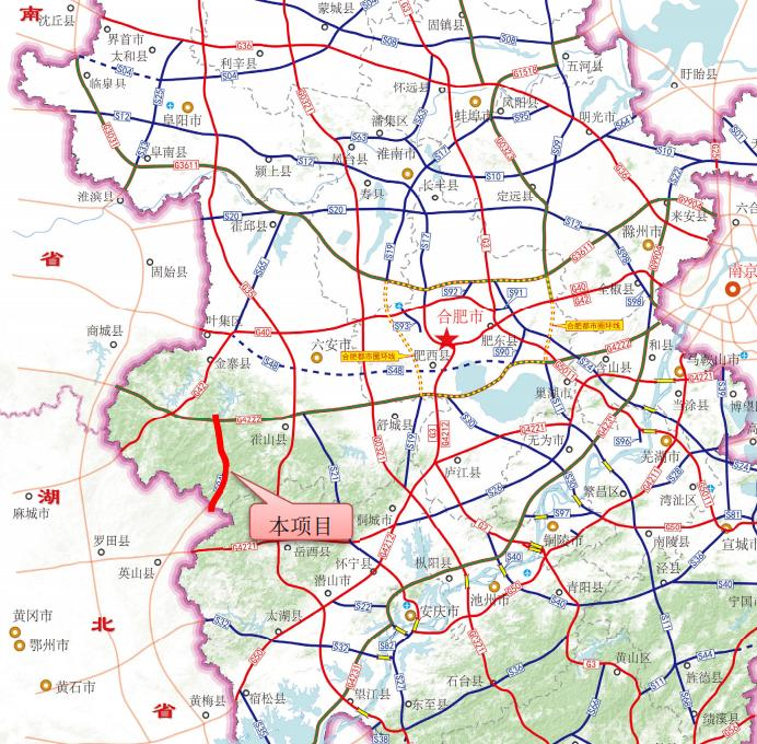 該項(xiàng)目呈南北走向,總體位于六安市金寨縣及霍山縣境內(nèi)。路線全長(zhǎng)約45.726公里,為山嶺重丘區(qū)、全封閉、雙向四車道高速公路,設(shè)計(jì)速度100公里/小時(shí),路基寬度26米。項(xiàng)目估算總投資約72.89億元,建設(shè)期3年、運(yùn)營(yíng)期(含收費(fèi)期)暫定30年。