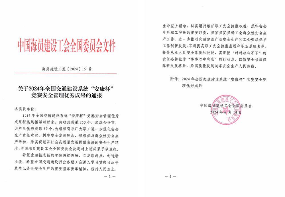 近期,中國海員建設(shè)工會全國委員會通報了2024年全國交通建設(shè)系統(tǒng)“安康杯”競賽安全管理60項優(yōu)秀成果,由集團(tuán)公司和建工三建共同制作的視頻作品《舉“安全之盾” 護(hù)“平安之航”》,從全國交通建設(shè)系統(tǒng)的253項成果中脫穎而出,獲評“安康杯”競賽安全管理優(yōu)秀成果。