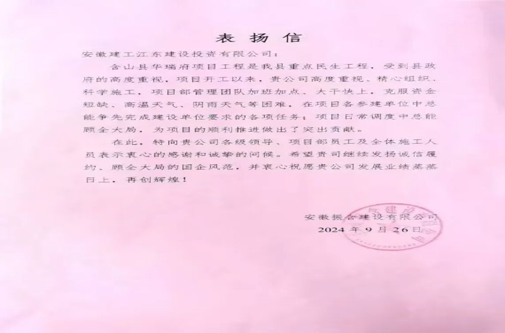 9月26日,安徽建工江東建投收到業主感謝信,信中對江東建投高度重視、精心組織含山縣華瑞府項目科學施工表示感謝,對項目團隊迎難而上、全力以赴、率先高效完成建設任務給予高度肯定。