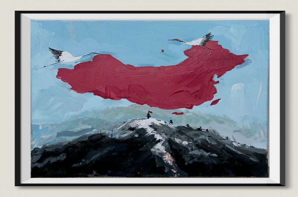 遠山含黛,層巒疊嶂,輕柔筆觸,勾勒出連綿山脈,宛如祖國脊梁,堅韌挺拔;淡雅墨色,潺潺流溢于山間河流,穿梭群峰,恰似母親秀發(fā),柔美飄逸,將對祖國母親的熱愛與敬仰,融入一筆一劃。