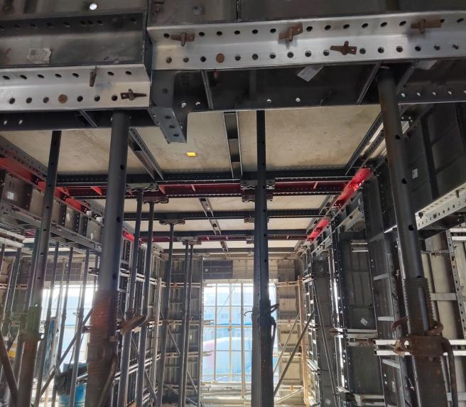 針對住宅樓豎向結構為M型鋼格構剪力墻、水平構件為疊合板的結構特點,項目部經過反復論證,采用非深化鋁模作為主體結構模板,鋁模拆除后,結構面平整,為墻體抹灰提供了良好的基層墻體。同時,對門頭過梁、短門垛、電梯井門頭過梁部分墻體進行了簡單優化,為砌體施工提供了有利條件。對比傳統木模搭配鋼管內支撐,項目通過應用非深化鋁模施工技術節約成本176.41萬元,減輕了施工現場材料堆放和周轉管理難度,提升安全文明施工形象,獲得了建設單位的認可和表揚。