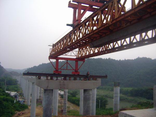 該橋左幅17跨,右幅16跨,為25 m先簡支后連續(xù)預(yù)應(yīng)力砼小箱梁,全橋共有箱梁132片,最大安裝重量75t。采用1套QD100T/30m架橋機,依次進(jìn)行K10+236.75大橋左右幅箱梁安裝,箱梁采用運梁炮車運輸。橋體處于本標(biāo)段標(biāo)尾與02標(biāo)接頭,橫跨大源河,交通不便,各種物資到達(dá)及站內(nèi)調(diào)車作業(yè)極為困難。為確保安全、優(yōu)質(zhì)地完成這次鋪架任務(wù),項目部精心組織,做好準(zhǔn)備工作,協(xié)調(diào)好各項事宜,制定了詳細(xì)、切實可行的架梁方案。
