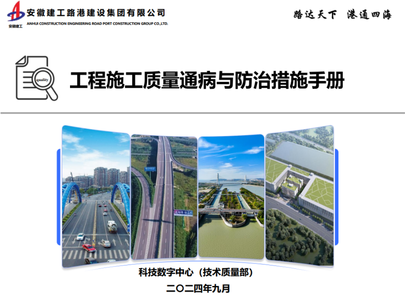 通病防治,推動標準化建設。為落實集團《關于加強集團公司工程項目施工現場技術質量管理的通知》文件精神,根據《2024年度質量技術數字(建工路港科技(2024)4號)的工作計化管理工作意見》的工作計劃,公司結合近年來項目管理經驗總結,在《工程施工質量通病與防治措施手冊》(2022版)的基礎上補充更新,并增加了隧道、水運、房建施工內容,手冊包括概述、常見質量通病、具體實例與防治措施、質量通病實用控制方法等章節,為項目工程質量通病防治提供參照依據。