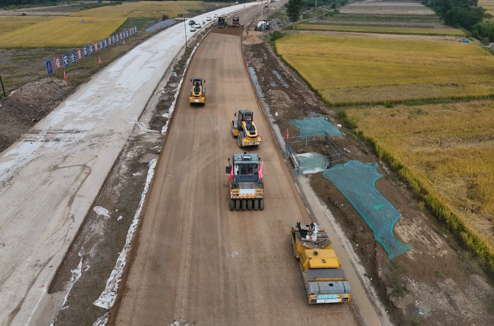 施工現場,攤鋪機、壓路機轟鳴不斷,作業工人緊密配合、標準作業,一派繁忙、有序的施工景象。經過10天緊張有序的施工作業,水穩層攤鋪順利完成,工程進度穩步推進。