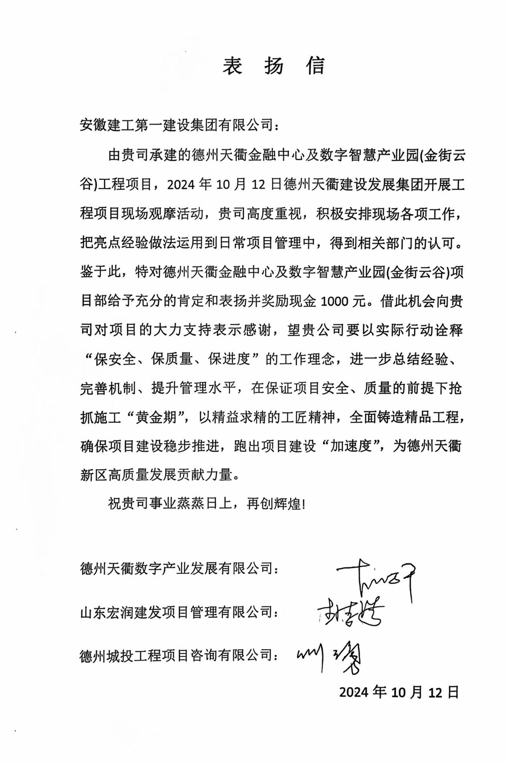 近日,天衢金融中心及數字智慧產業園項目在工程項目現場觀摩活動中,因項目安全、進度質量管控優異,經天衢建設發展集團評議,榮膺第一名,并獲建設單位、監理單位、項目管理單位集體表揚。