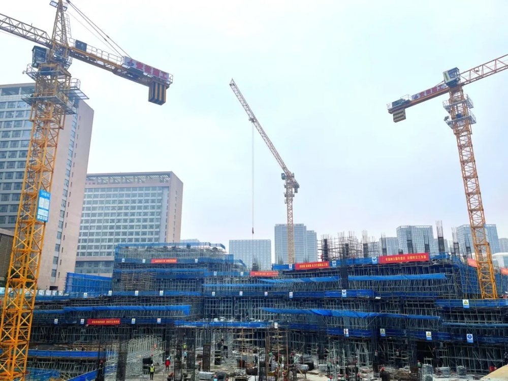 作為國內首家臨床研究醫院、合肥綜合性國家科學中心健康領域重大創新平臺,中國科學院臨床研究醫院項目已全面封頂。該項目存在多項不規則復雜超限結構,材料規格要求高,加之項目地理位置特殊,施工場地狹小,甲方要求工期緊等原因,給項目建設帶來挑戰。
