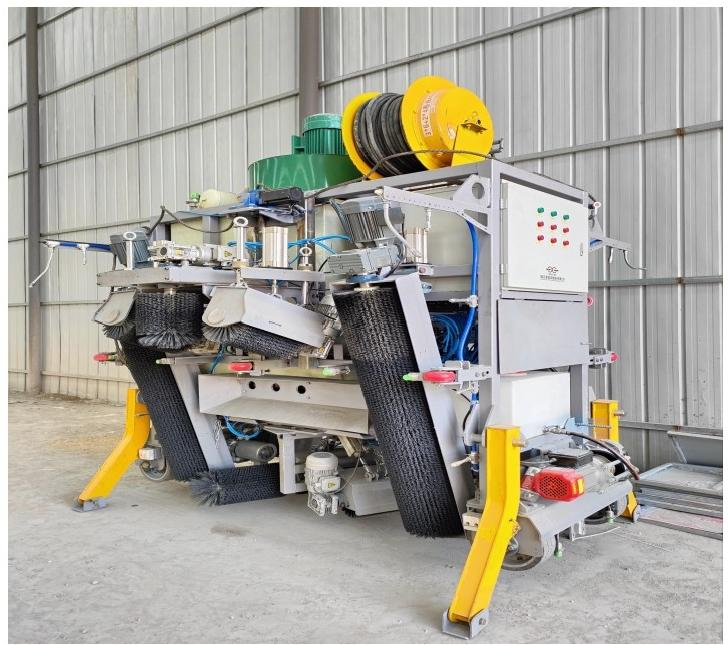 為此,公司創新運用了一種能夠適配不同型號箱梁模板的智能打磨機。該設備集成自行程、全液壓、全自動、自吸塵、自噴涂于一體,通過傳感器、控制器與專用軟件相結合,可分析處理數據來控制打磨輥的轉速、壓力、移動速度等,還能自動控制臂架姿態。相比傳統人工作業,新型打磨設備大大提高了效率,減少了人力需求,解決了作業人員面臨的高溫、粉塵、易滑落致傷等問題。