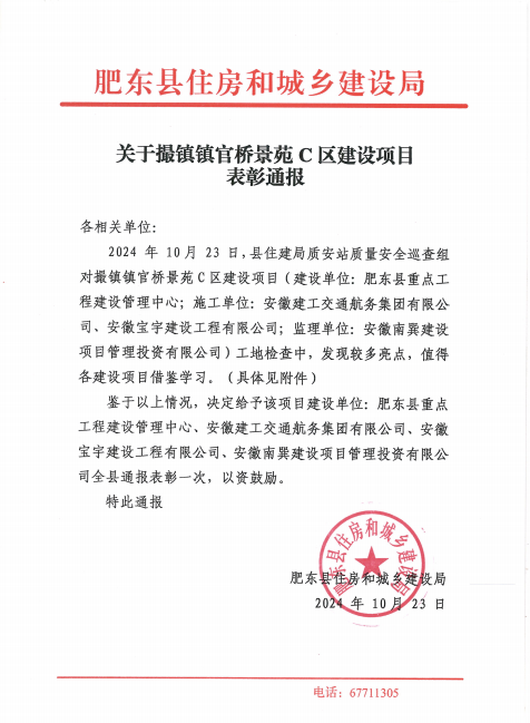近日,建工交航在建撮鎮(zhèn)鎮(zhèn)官橋景苑拆遷恢復(fù)樓C區(qū)建設(shè)項(xiàng)目喜獲肥東縣住房和城鄉(xiāng)建設(shè)局全縣通報(bào)表彰。
