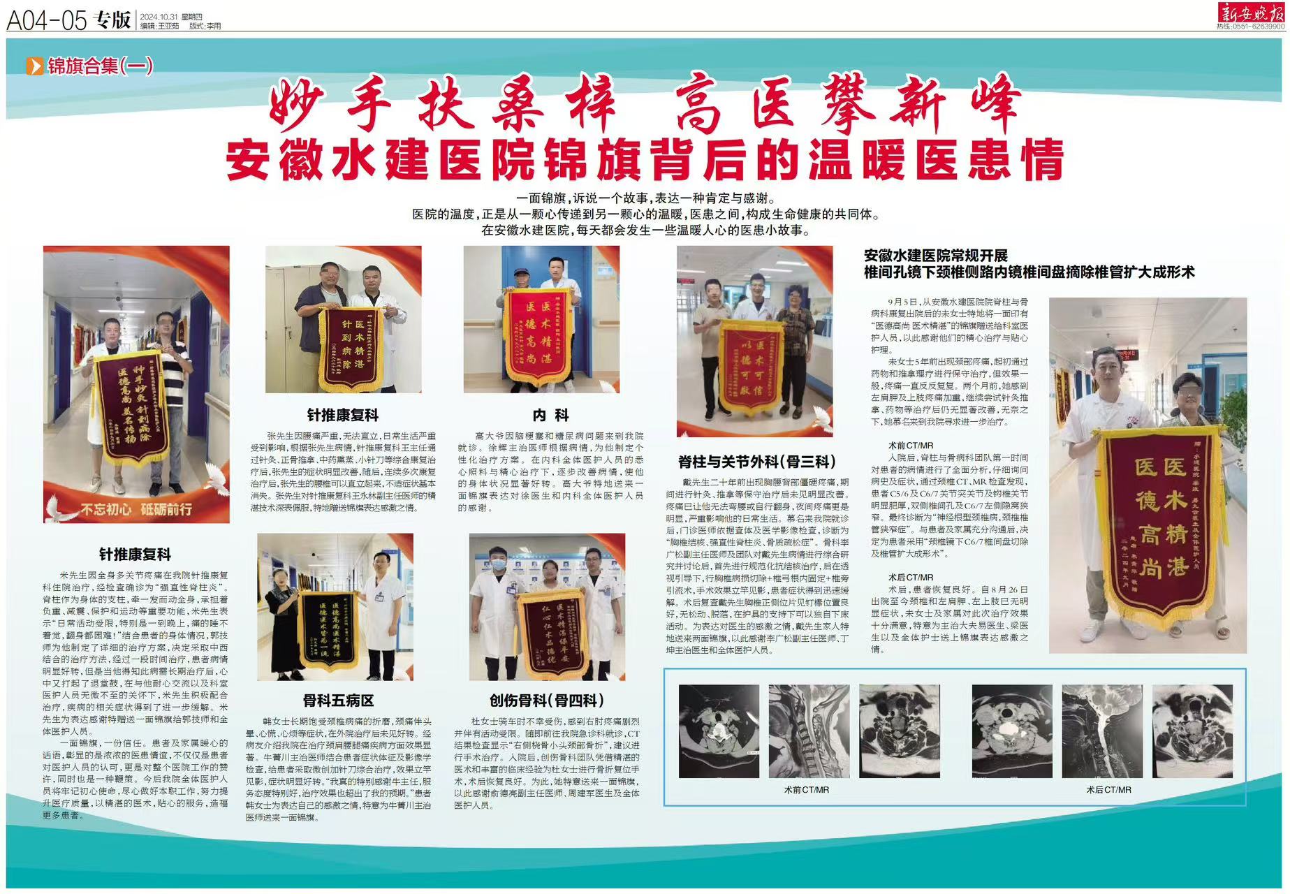 10月31日,新安晚報刊登了水建醫院《妙手扶桑梓 高醫攀新峰》專題報道,文章圍繞錦旗背后的溫暖醫患情進行了深情講述。