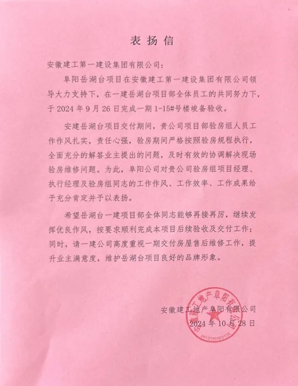 近日,安徽建工地產(chǎn)阜陽有限公司發(fā)來的表揚(yáng)信,表揚(yáng)建工一建領(lǐng)導(dǎo)對安建岳湖臺項(xiàng)目一期1-15#樓竣備驗(yàn)收工作的大力支持和項(xiàng)目部全體職工的勤懇付出。