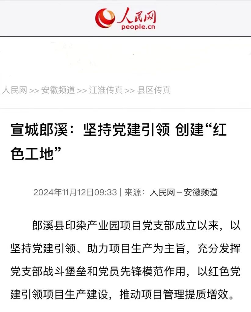 近日,安徽水利郎溪縣印染產業園項目充分發揮黨建引領作用,積極開展創建“紅色工地”,受到人民網等媒體關注報道。