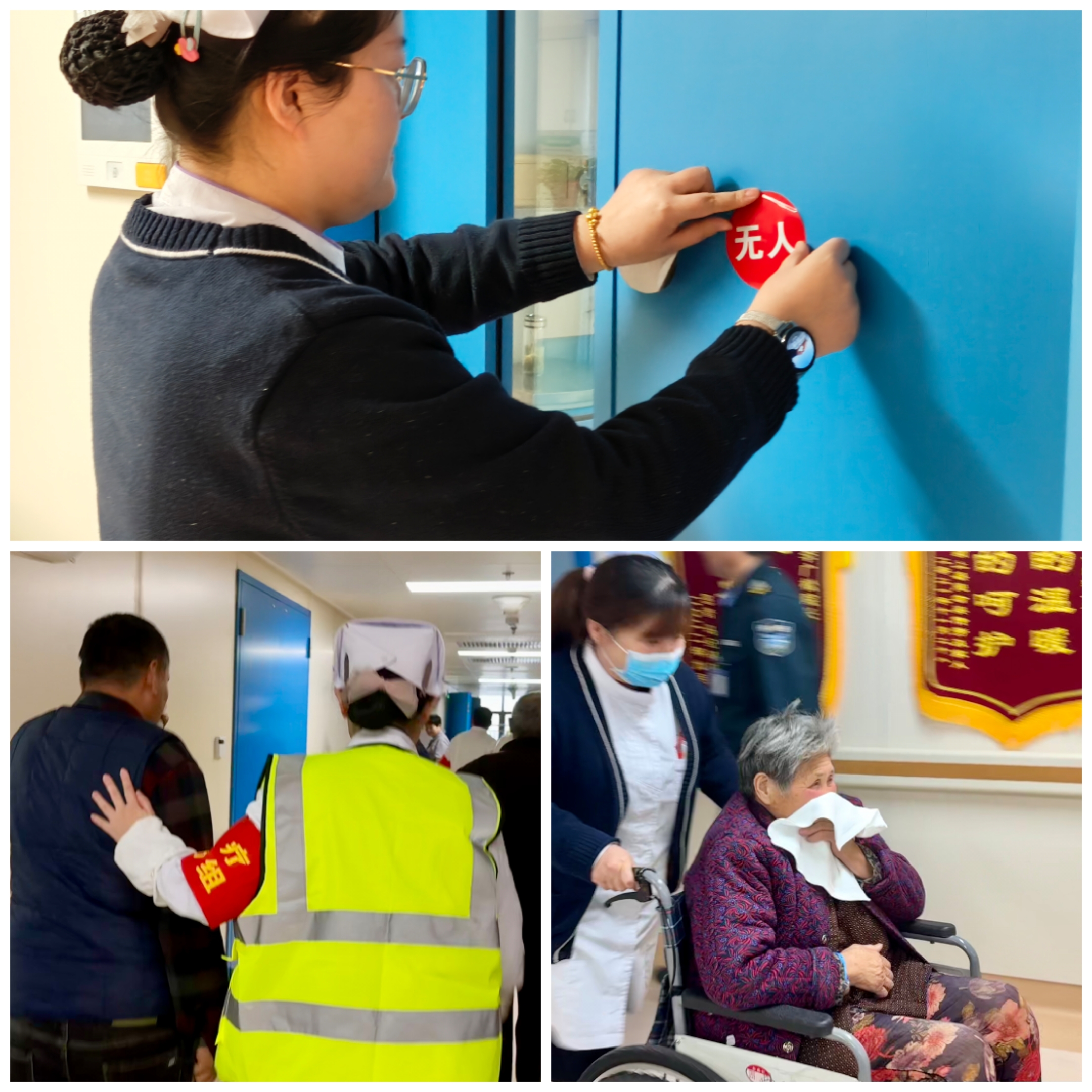 此次演練模擬住院樓11樓脊柱微創外科病房患者吸煙引燃被褥,易燃物被引燃,引起火災,值班人員發現火情后立即撥打“119”報警,并用滅火器進行初起火災的撲救。按照疏散演練預案,疏散引導組帶領病區患者及家屬彎腰、捂住口鼻沿著消防疏散路線有序撤離到指定安全地點。醫療救護組仔細檢查現場,做好救護工作,并在疏散后的房間貼上“無人”標識,確保疏散救援工作的準確性和高效性。