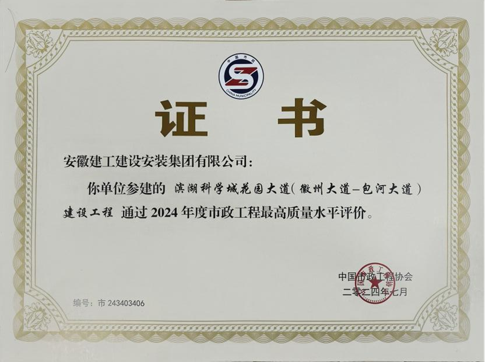 近日,中國市政工程協會頒發了2024年度市政工程最高質量水平評價獎證書,建工安裝濱湖科學城花園大道(徽州大道-包河大道)建設工程項目榮獲市政工程最高質量水平評價獎,這是本項目繼榮獲“華東優質安裝工程獎”、“黃山杯”之后的又一國家級獎項。