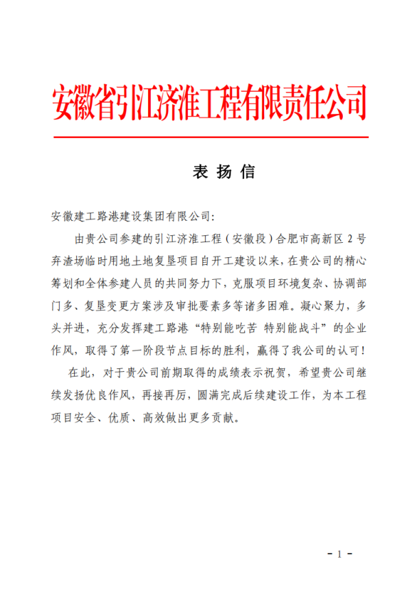 日前,建工路港引江濟淮2號棄渣場復墾項目收到安徽省引江濟淮工程有限責任公司的表揚信。